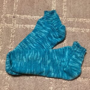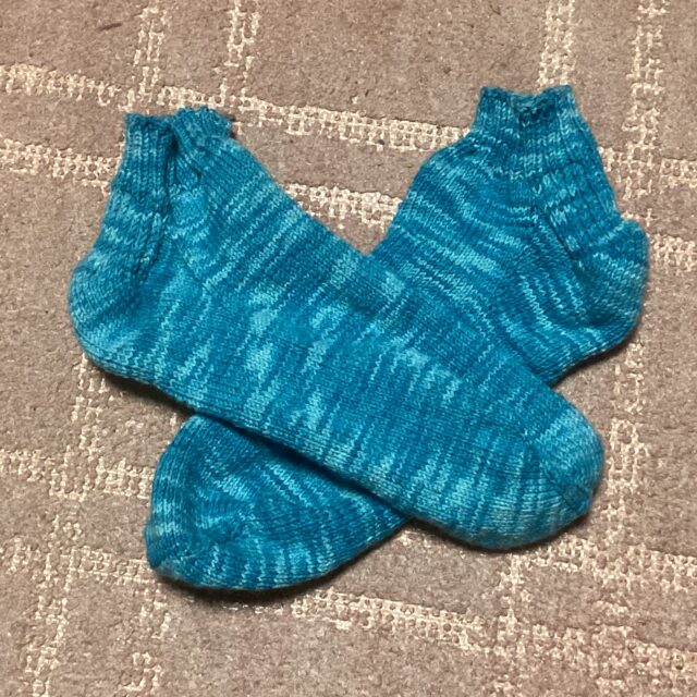 春夏用靴下 26号 COBASI 完成 投稿日 2025年11月27日投稿者 母 母です。すっかり寒くなってきたのに春夏用靴下の完成です。 使用糸:COBASI 968番curaçao 25.2g 使用針:1号 今回はマジックループで編んでみました。普段は片足ずつ編むのが好きなんですが、今回は50gで1足編む為にマジックループでテンションを同じにすればほぼ両足同じ量でいけるかと思ったんです。これがCOBASI 4足目なんですが、25gで編めませんでした。1gくらい足りないんです。4色を混ぜて3足編むか、1〜3段くらい減らすか迷っています。